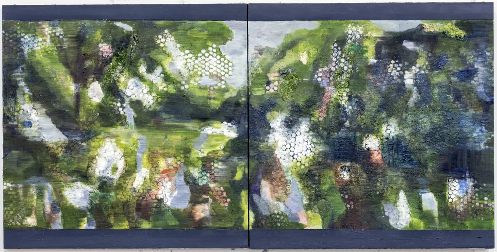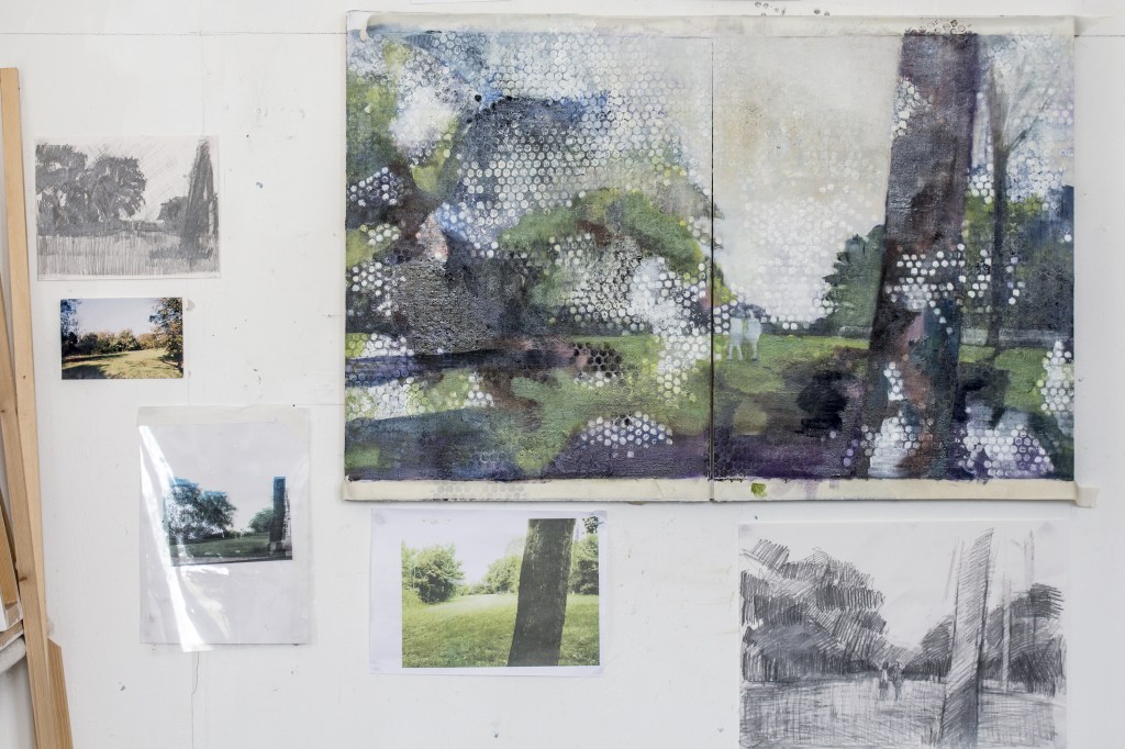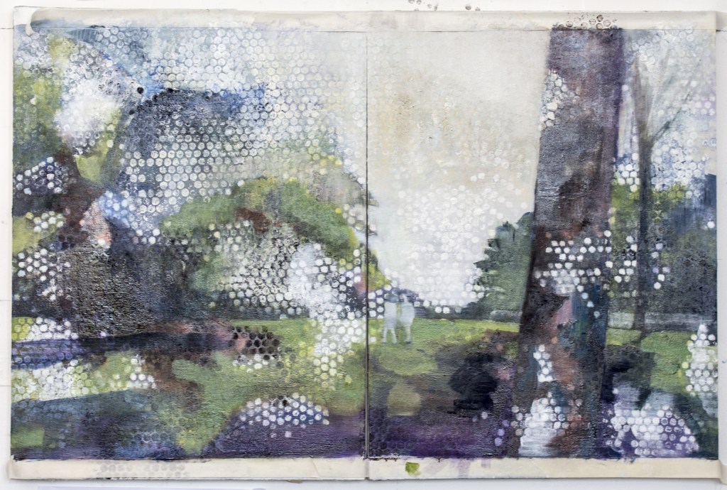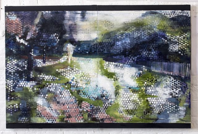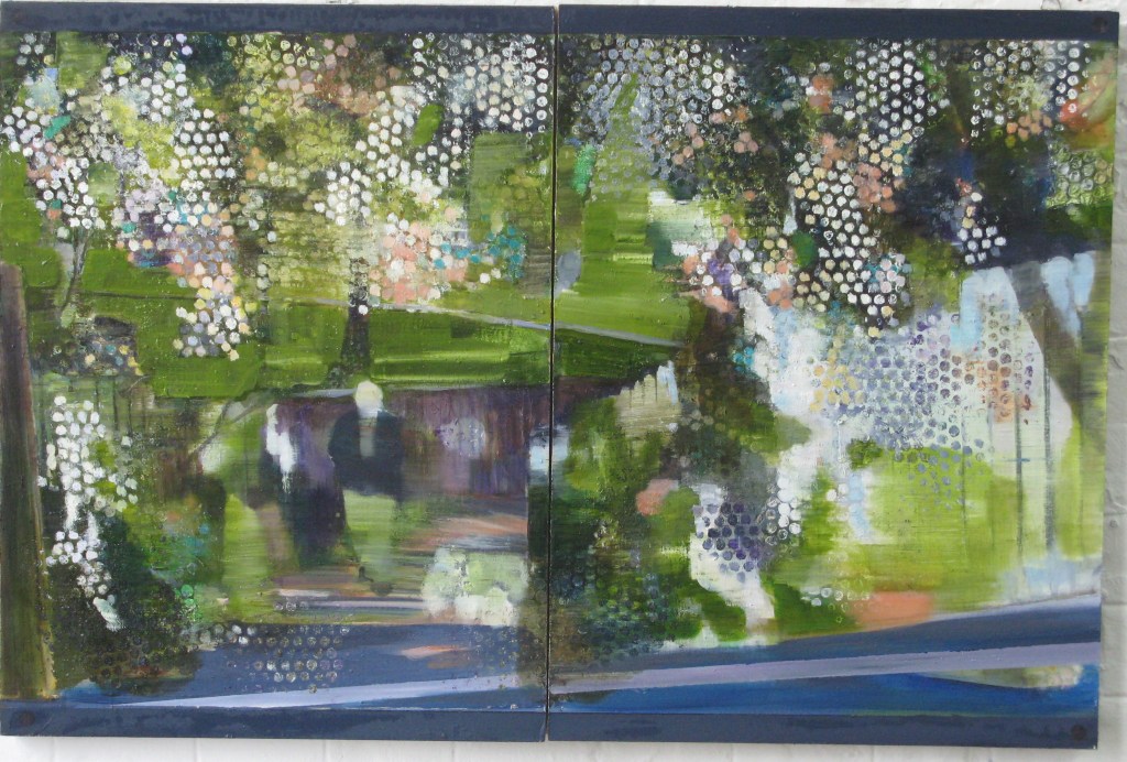 This group of paintings was based on a short sequence from Michangelo Antonioni’s film ‘Blow-up’ (1966). I visited the location at Maryon park, Woolwich in London on many occasions, taking photographs and drawing. Most of the scene was shot in a single secluded location which remains hardly altered today. The paintings combine elements of film stills with views of the location as it is now. The encounter of site and sight, of topography and fictional narrative and of the apparent veracity of the photographic with painterly subjectivity has created a fascinating space. A kind of space where all kinds of elements can overlap and co-exist whilst not escaping into fantasy – an over painting of reality rather than a denial of it. Each one is oil paint with some collage on two panels. they are all 92cm X 62cm, except for one.