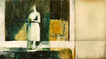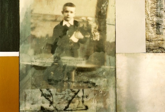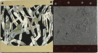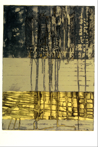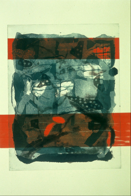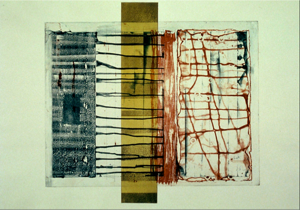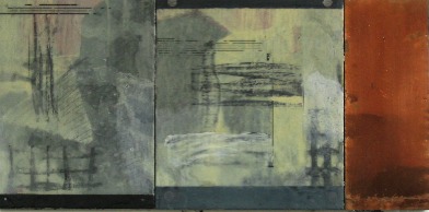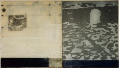 These paintings use a variety of sources as their starting points, including postcards and fragments of photographs from various sources including mass media . Juxtapositions are created through articulating different surface qualities and the use of over layering as well as combinations of imagery. In retrospect I can see how this work was influenced by my involvement with printmaking, and specifically etching in the 1990’s (see three examples below). The transfer of visual information from one surface to another, from one medium to another and the creation of an indeterminate field of meaning were interests at this time. All the paintings are acrylic with various mixed media on multiple panels, sometimes with metal inserts. They vary in size from 50cm x 40cm to 100cm x 50cm